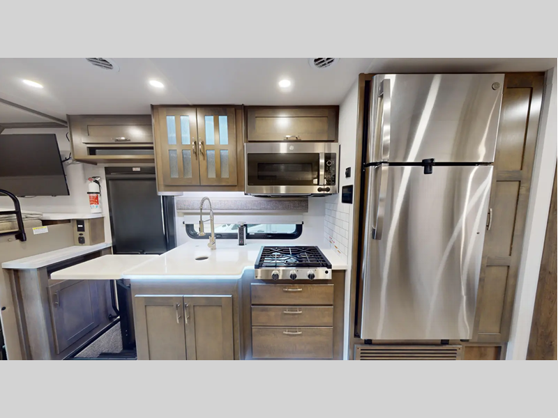 Sleeps 4 Slides 1 Length 31 ft 2 in Ext Width 8 ft Ext Height 12 ft 4 in Int Height 6 ft 10 in Interior Color Saddle, Milano II Exterior Color Optional Single Color Full Body Paint, Optional Xplorer Package Full Body Dark, Light Hitch Weight 10000 lbs GVWR 19500 lbs Fresh Water Capacity 78 gals Grey Water Capacity 45 gals Black Water Capacity 45 gals Tire Size 225/70R19.5G Furnace BTU 40000 btu Generator 8KW Onan Diesel Fuel Type Diesel Engine Cummins 6.7L I6 Turbo Chassis Ram 5500 SLT Horsepower 360 hp Fuel Capacity 52 gals Wheelbase 217 in Number Of Bunks 1 Available Beds RV Queen Torque 800 ft-lb Refrigerator Type 12V Two Door Compressor Driven Refrigerator Size 10 cu ft Convection Cooking Yes Cooktop Burners 3 Number of Awnings 1 Axle Weight Front 7250 lbs Axle Weight Rear 13500 lbs LP Tank Capacity 20.3 gals Water Heater Type Truma Aqua Go Comfort On Demand AC BTU 30000 btu TV Info LR 42" LED Smart TV, BR 32" LED Smart TV Awning Info 16' Armless w/LED Lighting and Motion Activated Retraction Gross Combined Weight 37500 lbs Shower Type Standard Electrical Service 50 amp Solar Wattage 200 watts Similar Floorplans
