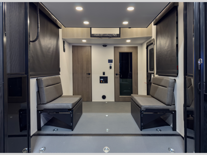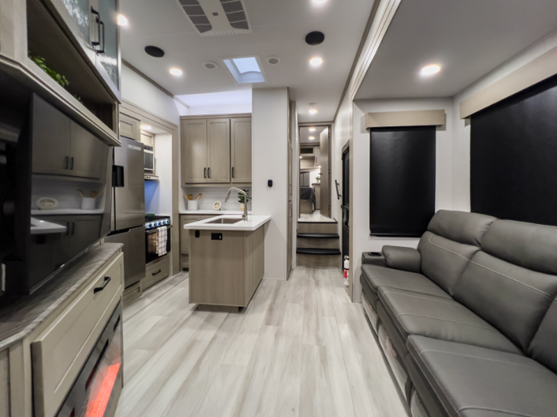 Each model also includes a universal docking center, a fiberglass front cap with paint and LED lighting, a heated and enclosed underbelly for four seasons of traveling, and a dovetail rear end. The Momentum G-Class also comes with large panoramic windows, residential cabinetry, motion-sensor lighting, and stainless steel-accented appliances. The fun will not stop when listening to the exterior speakers, and the awning with LED lighting will create an outdoor living space you are sure to love.