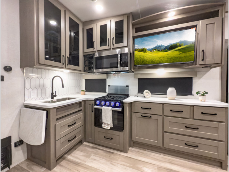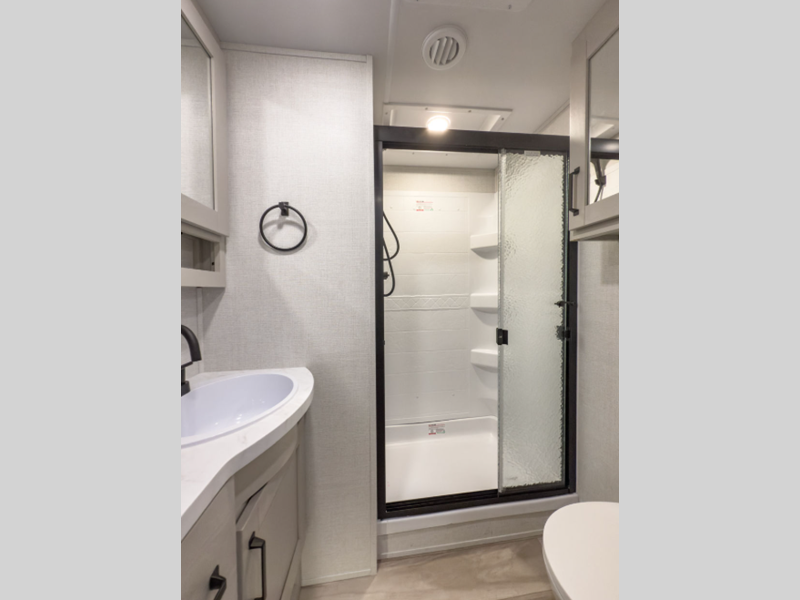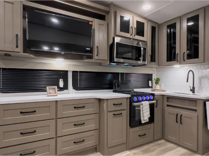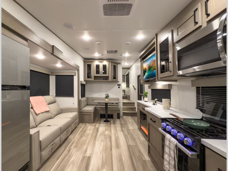 Each fifth wheel has 90-degre turning radius capabilities which allows you to be comfortable driving in town and parking into your campsite. Some construction and Arctic 4-Seasons Protection package features include a one-piece TPO roof membrane, a heated and enclosed underbelly with circulating heat, 12V heat pads on the holding tanks, and a heated pass-through storage area so you can travel and enjoy any climate. The interior offers large panoramic slide room windows for great views, premium Congoleum flooring for durability, and an On Demand water heater.