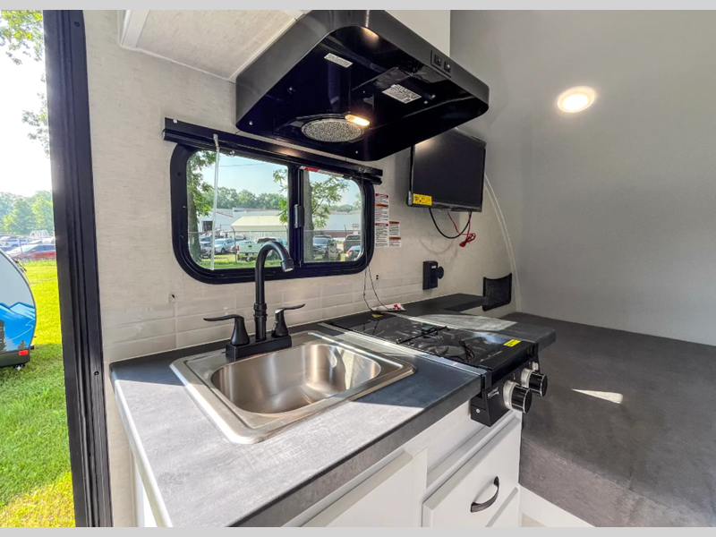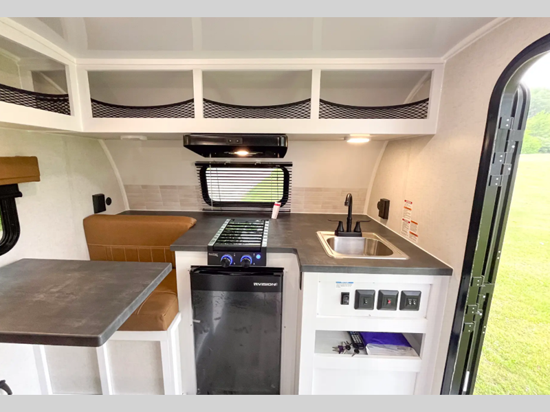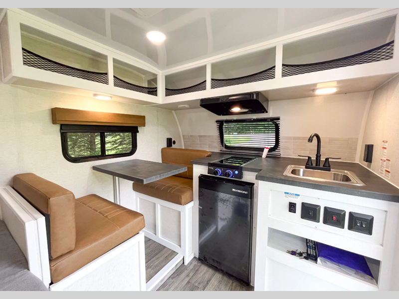 Sleeps 3 Length 14 ft 8 in Ext Width 6 ft 11 in Ext Height 9 ft 4 in Int Height 6 ft 2 in Dry Weight 2198 lbs Fresh Water Capacity 16 gals Grey Water Capacity 18 gals Tire Size ST235-75R15 Refrigerator Type Large Cooktop Burners 2 Axle Weight 3500 lbs Water Heater Type Fogatti On Demand Axle Count 1 Shower Type N/A -